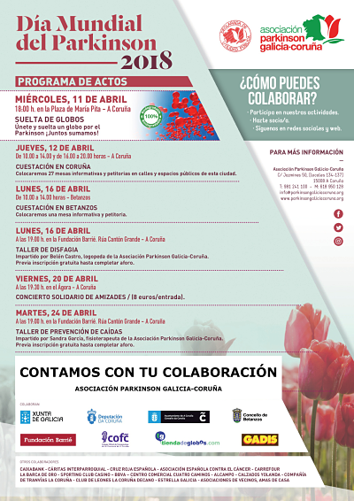 Miércoles, 11 de abril, a las 18:00, con motivo del Día Mundial del Párkinson, se realizará un acto de sensibilización e información sobre la enfermedad en la Plaza de María Pita, en A Coruña. Las personas afectadas pueden llevar una vida normal gracias al apoyo de su entorno; sin embargo, muchos ocultan la enfermedad por miedo al rechazo social. Se sienten incómodos o avergonzados y se recluyen. Esto provoca que, en parte, su enfermedad sea un prejuicio social. Por esto, creemos que hay que cambiar el punto de vista que la sociedad tiene de la enfermedad.
