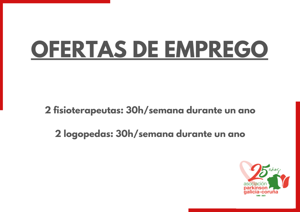 – 1 persoa graduada ou diplomada en fisioterapia, encargada de ofrecer fisioterapia rehabilitadora para persoas con párkinson. O contrato sería dun ano de duración, 30h/semana.