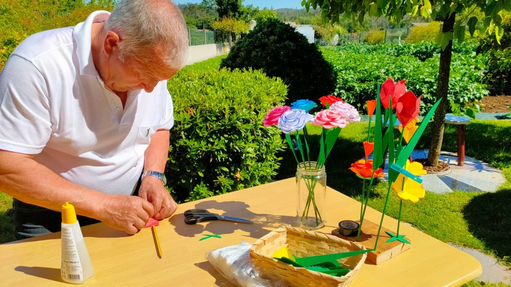 Un retiro que le ha servido, debido al insomnio que provoca la enfermedad, a redescubrir otros talentos que tenía ocultos. Él es quién nos llena de color cada rincón de la asociación con sus flores hechas de papel, ninguna se le escapa. “Grazas a Youtube aprendín a facer tódalas manualidades”, confiesa entre risas. Es una delicia ver con el cuidado que corta el papel, “teño de tódalas cores”, y la manera en que hace cada pliegue del papel. Parece poesía visual como encaja todas las piezas para darle vida a cada una de sus creaciones.